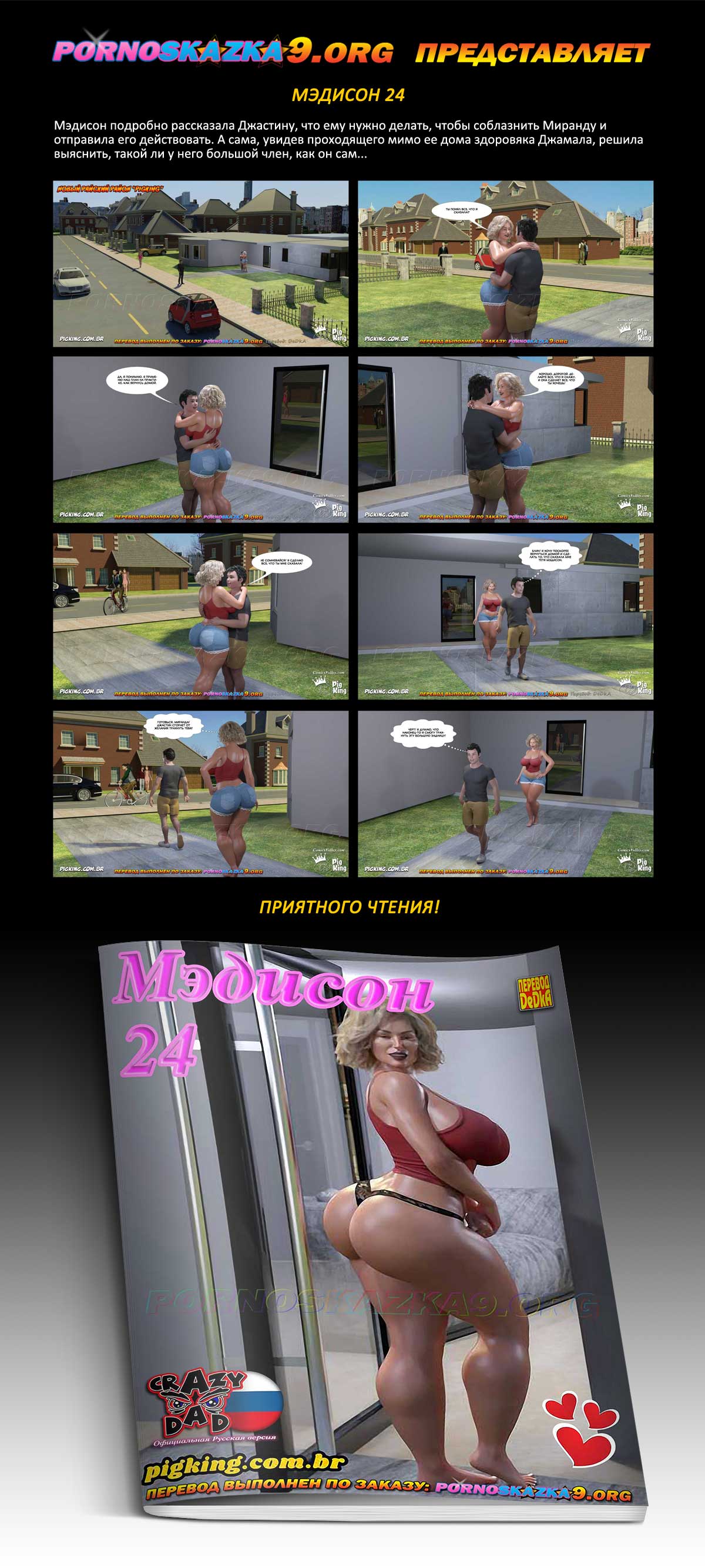 Порно комикс «Мэдисон. Часть 24». Мэдисон подробно рассказала Джастину, что ему нужно делать, чтобы соблазнить Миранду и отправила его действовать. А сама, увидев проходящего мимо ее дома здоровяка Джамала, решила выяснить, такой ли у него большой член, как он сам…